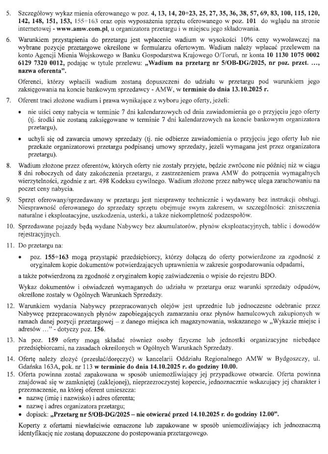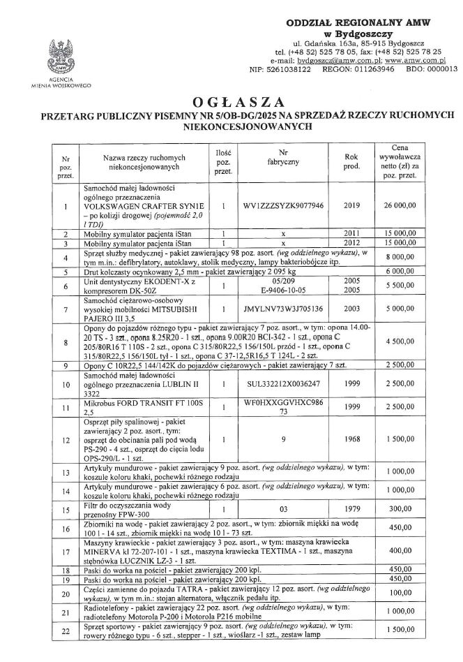 Ogłoszenie o przetargu publicznym pisemnym nr 5/OB-DG/2025 na sprzedaż rzeczy ruchomych niekoncesjonowanych